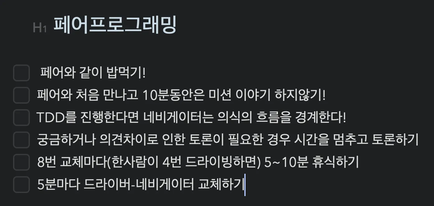 오늘은 오전에 글쓰기 수업, 오후에는 테코톡 및 페어의 스터디 일정이 있었기에 하루 모든 시간을 쏟기에는 어려움이 있었습니다. 이에 4시 ~ 5시를 코어타임으로 지정하고 이 외의 시간에는 시간 되면 페어프로그래밍을 계속 진행하는 방향으로 계획했습니다.