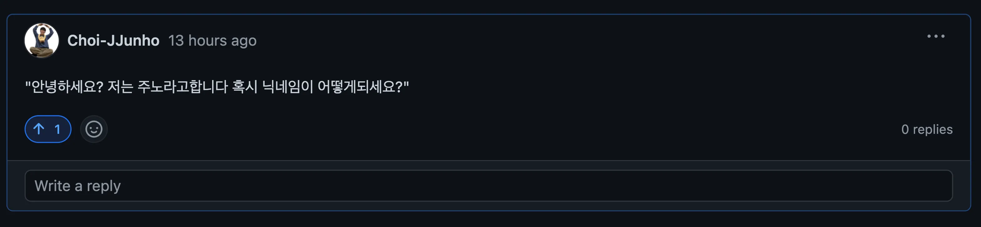 github discussion의 레벨1 글쓰기 “한 문장 쓰기”에 한문장 글쓰기를 하는데 우테코에 와서 가장 많이 한 말이였던 “안녕하세요? 저는 주노라고합니다 혹시 닉네임이 어떻게되세요?” 라는 말이 적고싶어 적었습니다 🥹
