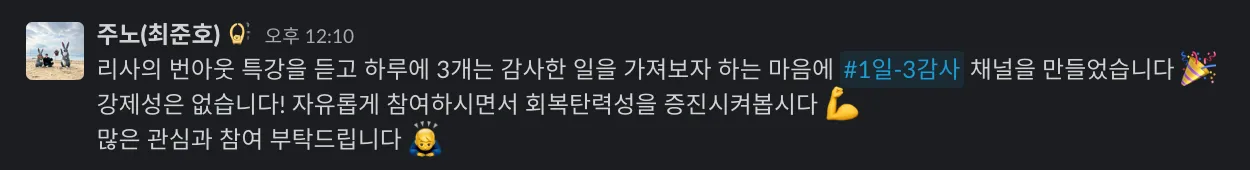 회고에 1일 3감사를 작성해보려고 했는데 하나의 글에 관리할 항목이 많아져서 슬랙 채널로 팠습니다..^^