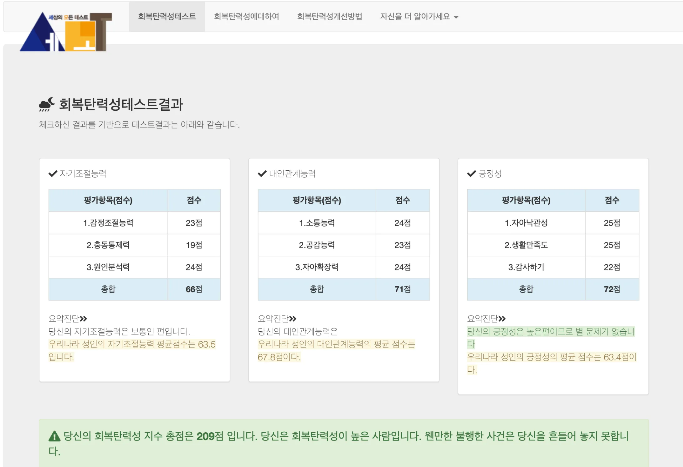 수업 시작 전 회복 탄력성 테스트를 해봤습니다. 저는 회복 탄력성 점수가 209점이 나왔네요 😮