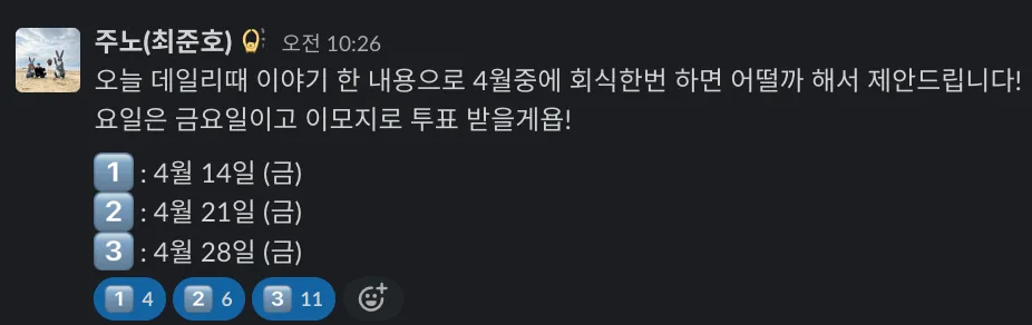 데일리 마무리를 하면서 이번 데일리 조는 빠르게 친해지고싶어서 회식 날짜를 투표받기로 했습니다 🔥🔥