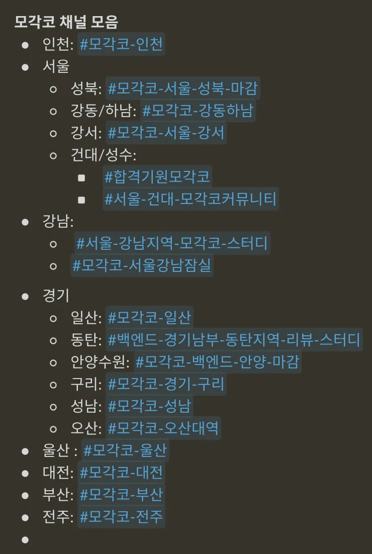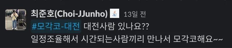 대전에 살고있는 나는 코수타가 끝나고 슬랙 채널에서 하나둘씩 생겨나는 지역별 모각코 모임을 보고 대전은 언제 생기지..? 하고 기다리고있었다. 하지만 나는 한가지 간과한 것이 있다.