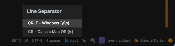 IntelliJ의 우측 하단을 보면 LF 혹은 CRLF라고 쓰여져 있는 모습을 볼 수 있다.