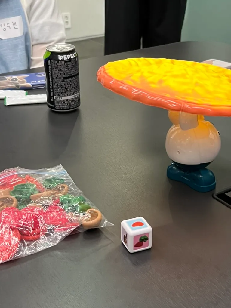 수민님이 보드게임도 가져오셔서 흔들흔들 피자토핑 게임도 했다 🍕 토핑 무너뜨린사람이 질문하기 했는데 내가 와르르 무너뜨려버렸다 😅 (질문하고싶어서 그런거 아니에요~)