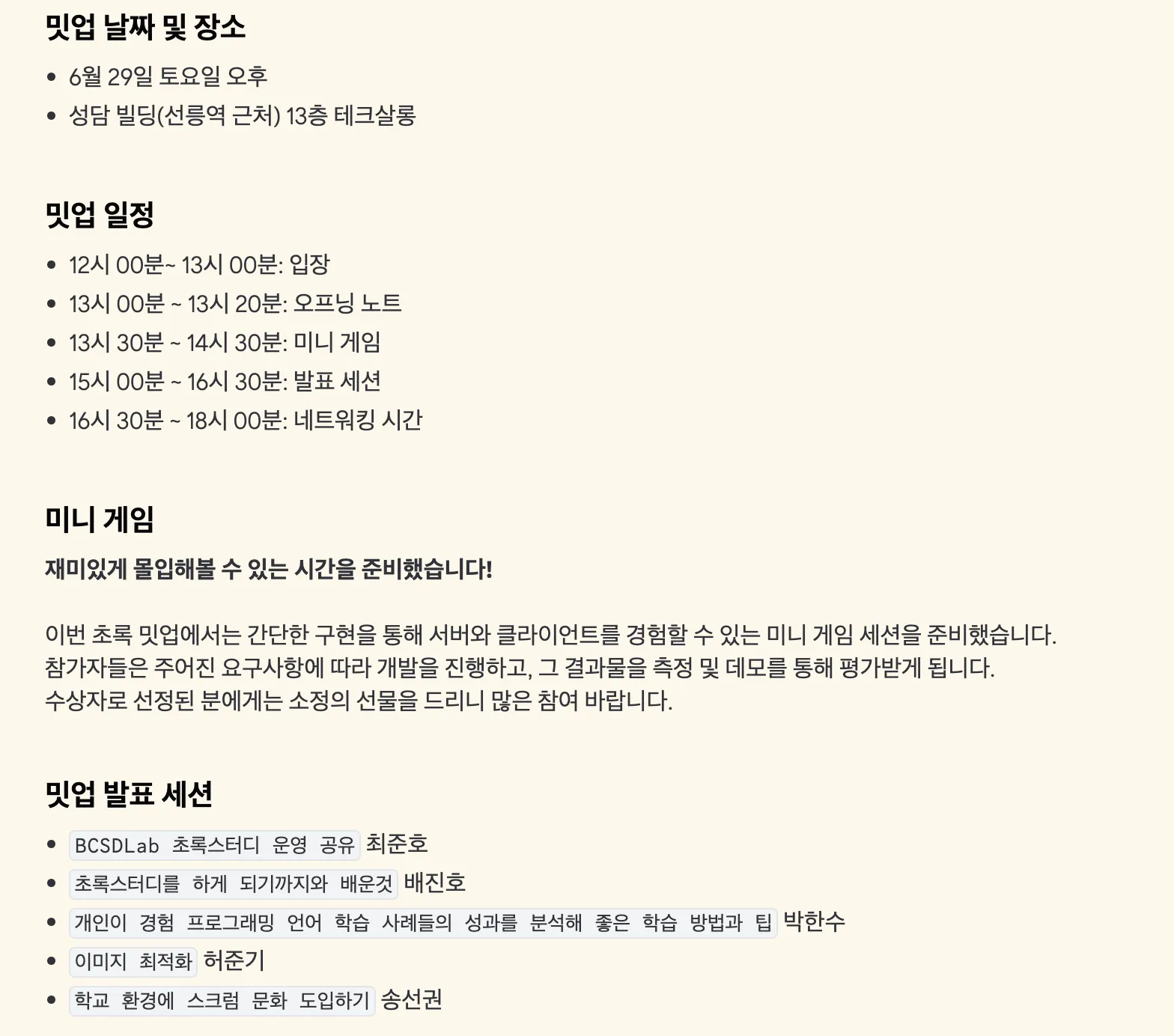 초록스터디를 운영하시는 코치님들께서 밋업 준비를 너무 잘해주셔서 풍족한 밋업을 즐길 수 있었다 😋