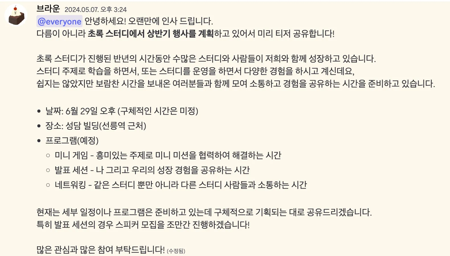 지방에 있는 대학 특성상 이런 네트워킹 자리가 너무 소중하다고 생각한다. 감사하게도 초록스터디를 경험해보지 않아도 조직의 구성원이면 참여할 수 있게 해주셔서 이 공지가 올라온 시점부터 동아리원들에게 적극적인 참여를 독려하기 시작했던 것 같다.