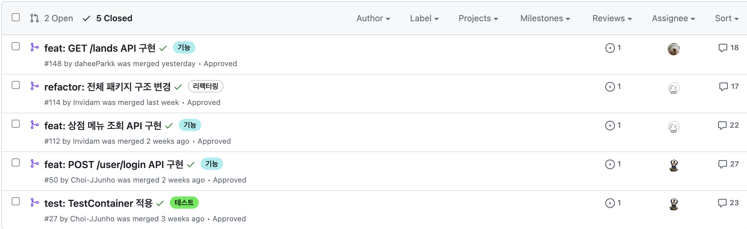 프로젝트에 참여하고 있는 인원들이 각자 PR을 1회 이상 생성해봤다. 이는 PR을 올리는 것에 대한 두려움을 최소화시키는 발걸음이자 작업환경을 구성하는데 있어 가장 중요한 일이라고 생각했다.