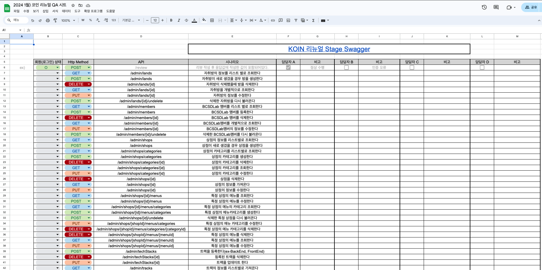 QA 진행에 앞서 QA 체크리스트를 만들어봤다. 막상 만들고 나니 해당 QA를 진행할 여력이 안났다. 그리고 API별이 아닌 시나리오별로 체크리스트를 만드는게 맞다는 생각이 들었다. 백엔드 개발자 중심의 QA 시트를 작성할게아니라 인수테스트를 별도로 만들어서 수행하는 것이 더 올바른 방향이라는 생각이 들었다.