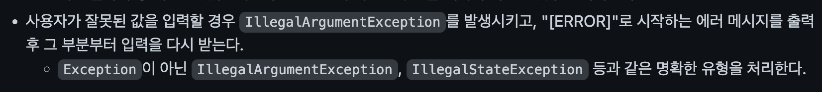 여담이지만 우아한 테크코스 프리코스 4주차에서 주어진 조건중 다음과 같은 조건이 있었다. 아마 이 장에서 설명하는 예외에 의미를 제공하라는 의도를 내포하고 있었던 것 같다.