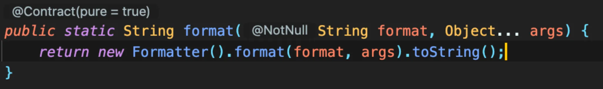 실제 String.format 선언부를 살펴보면 Object… args로 가변인수를 나타내는 것을 확인할 수 있다.