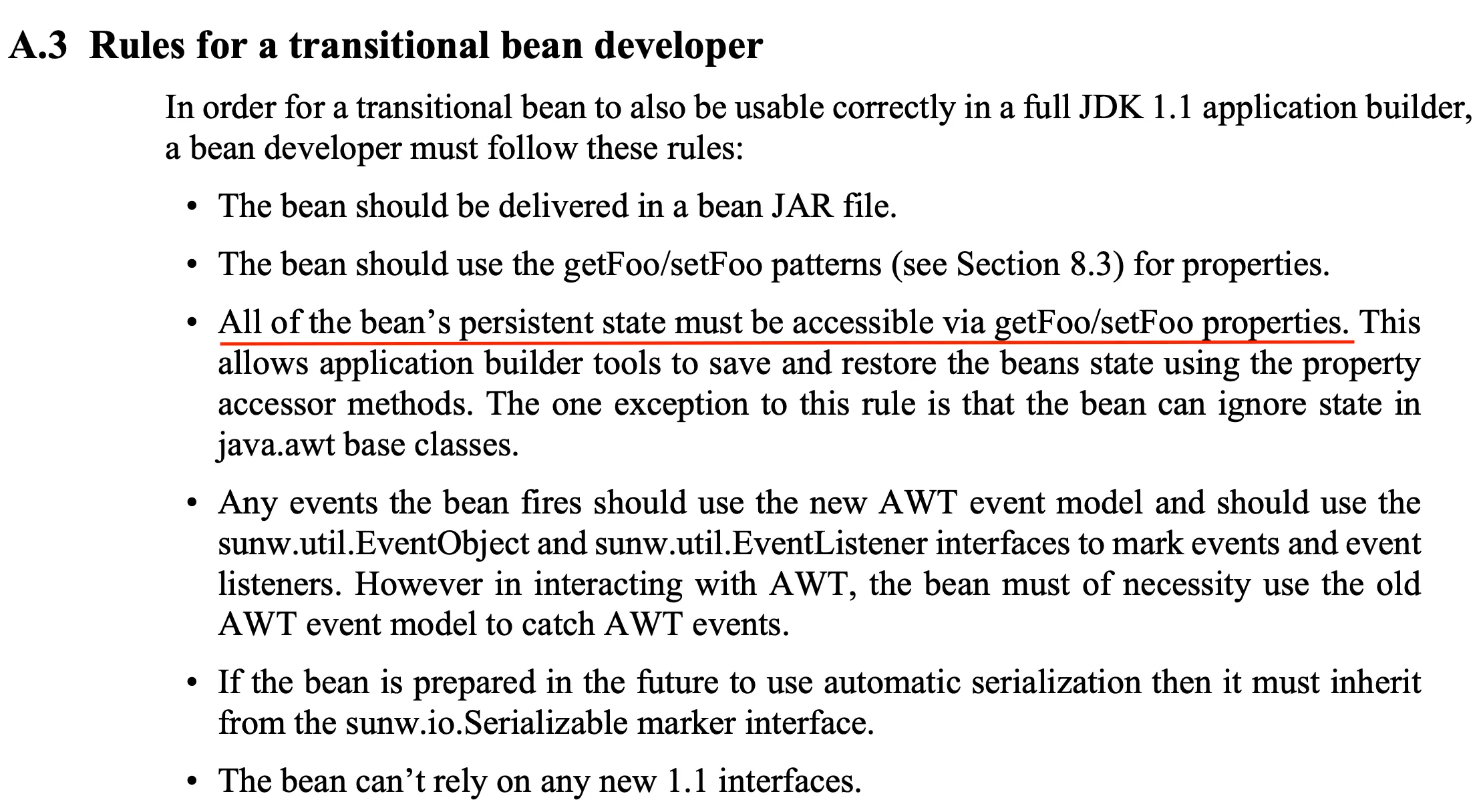 접근자, 변경자, 조건자는 javabean 표준에 따라 값 앞에 get, set, is를 붙인다. JavaBeans(TM) Specification 1.01 Final Release