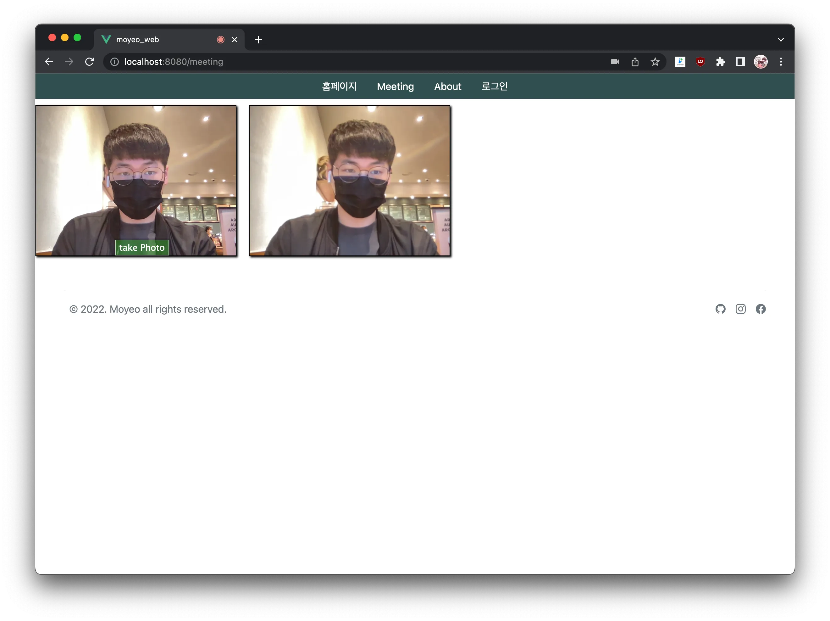 video 태그 부분에 웸캠으로 녹화하는 화면이 표시된다. takephoto button을 누르면 현재 화면을 스크린샷 한다.