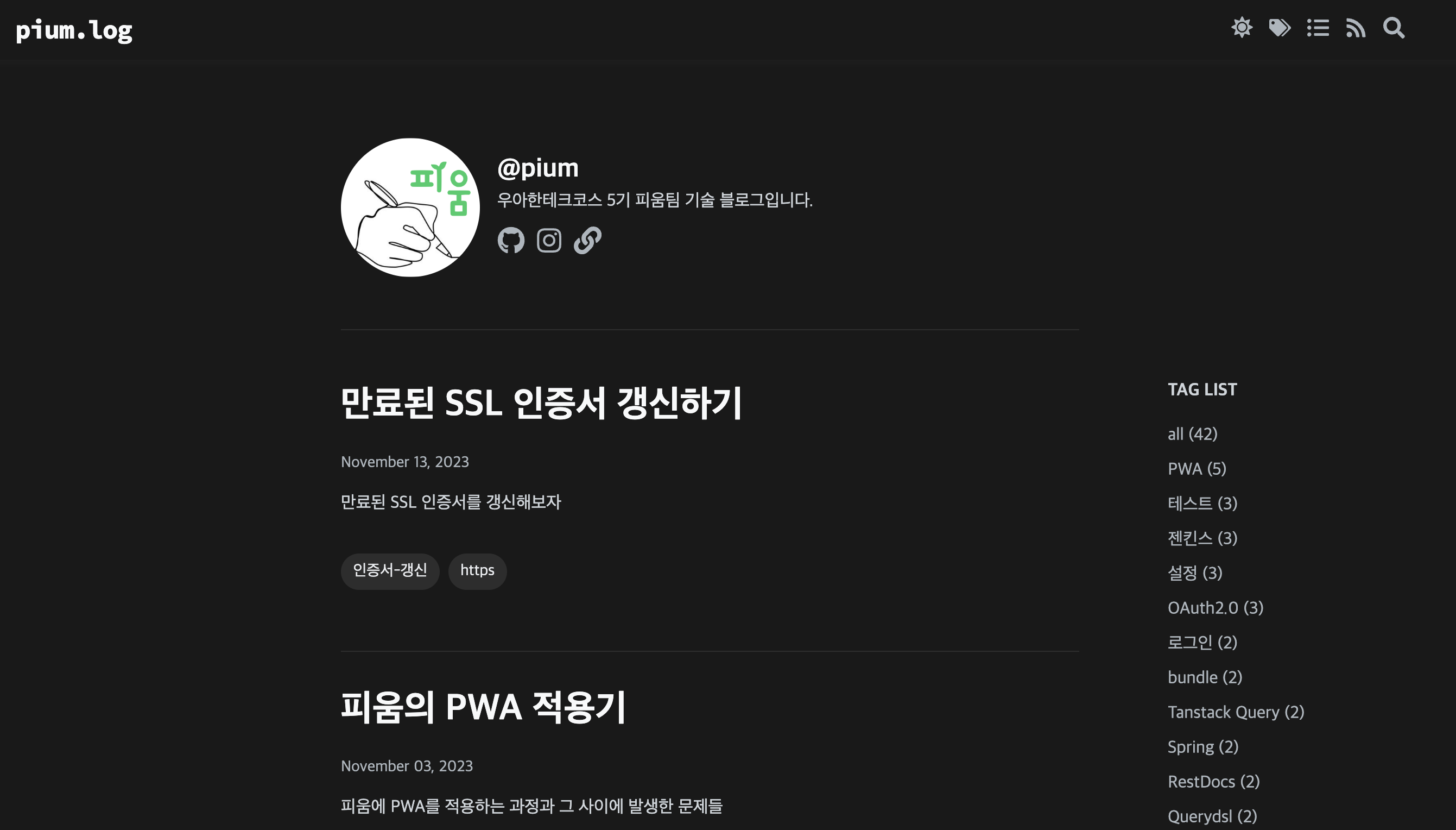 팀 블로그: https://pium-official.github.io/ 팀 discussion: https://github.com/woowacourse-teams/2023-pium/discussions 팀 wiki: https://github.com/woowacourse-teams/2023-pium/wiki