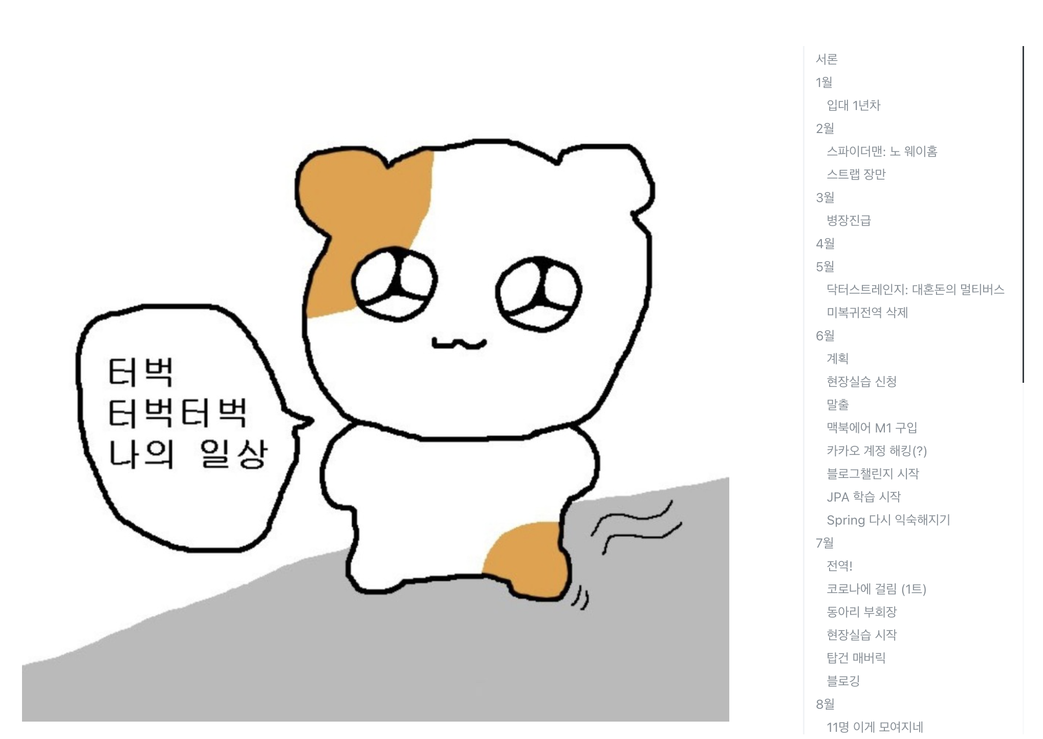 작년의 나는 어떤 회고를 했나 돌아봤는데 월별로 있던 일을 모조리 적어내려가는 회고를 작성했었다. 아무래도 군대, 현장실습, 우테코 프리코스.. 1년동안 3개의 조직을 경험한 탓이였을까 카테고리를 나누기가 어려워서 그랬던 것 같다.