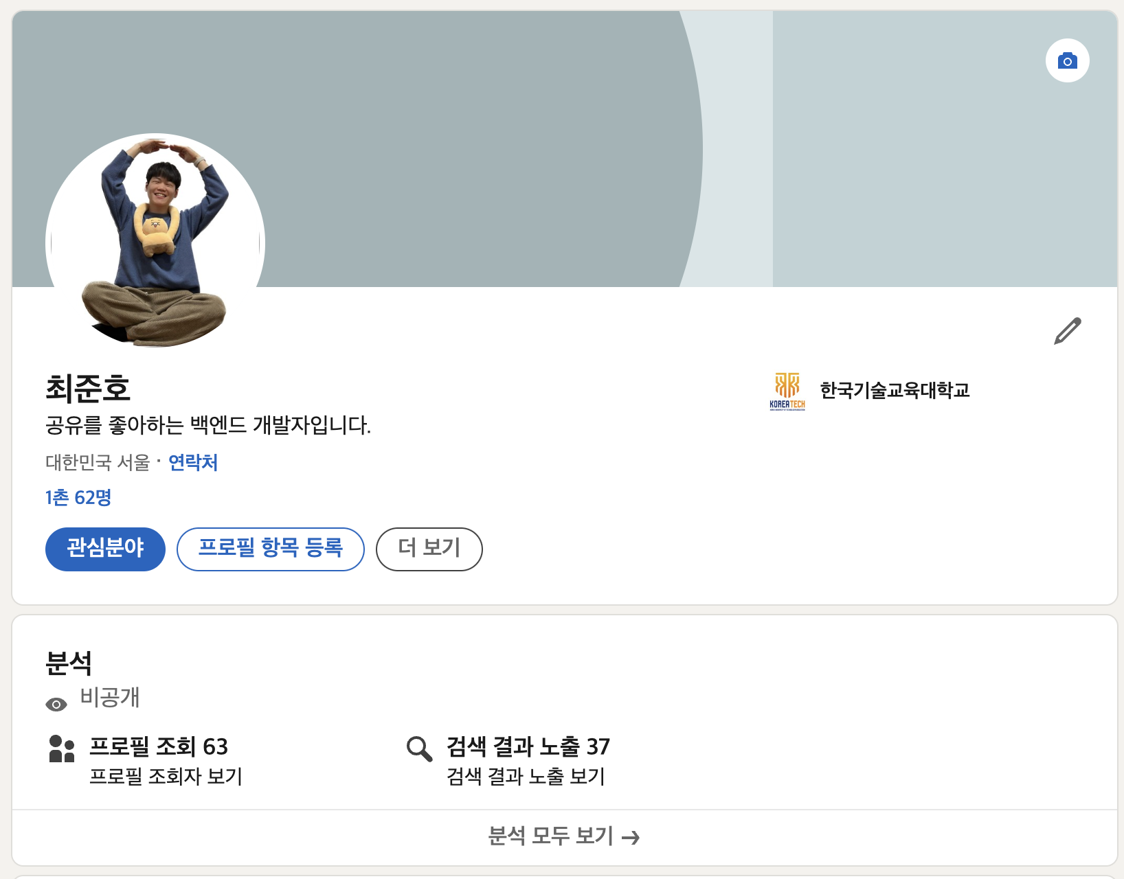 우테코에서 오잉이 LinkedIn 프로필을 멋지게 꾸민 모습을 자랑하길래 나도 따라 꾸며보기도했다. 🔗 최준호 | LinkedIn
