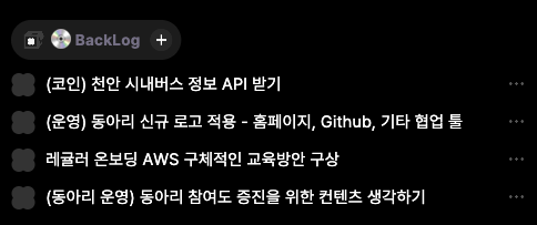 동아리 신규 교육인원들이 정규인원으로 전환되면서 프로젝트에 참여하는 시점이 점점 다가오고있다. 해당 인원들이 빠르게 적응할 수 있도록 협업 프로세스를 잘 만들어놔야한다는 계획 또한 잘 진행해봐야겠다.