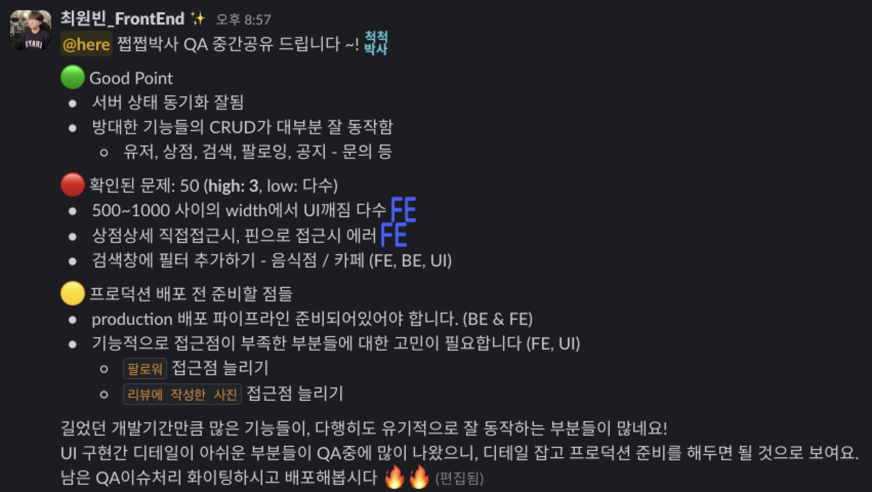 백엔드도 API 개발을 마친 상태고 FrontEnd에도 가용할 수 있는 인원이 꽤나 많은 상황이였다. 하면 할 수 있는 상황이라 더이상 미룰 수 없다고 판단한 나랑 프론트엔드 수장(?) 친구가 목소리를 내어 QA를 강행하고 Production 배포까지 후다닥 진행시켜버렸다.