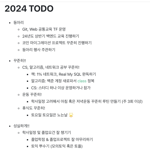 방향성이 없다고 생각되거나 할일이 없다고 느낄때는 2024 회고에서 TODO 라고 작성해놨던 부분을 상기하면서 할수있다!를 외쳐보자. 23년 말에 작성한 TODO보다 훨씬 더 많은 일들이 생긴 지금이지만 오히려 좋다고 생각한다.