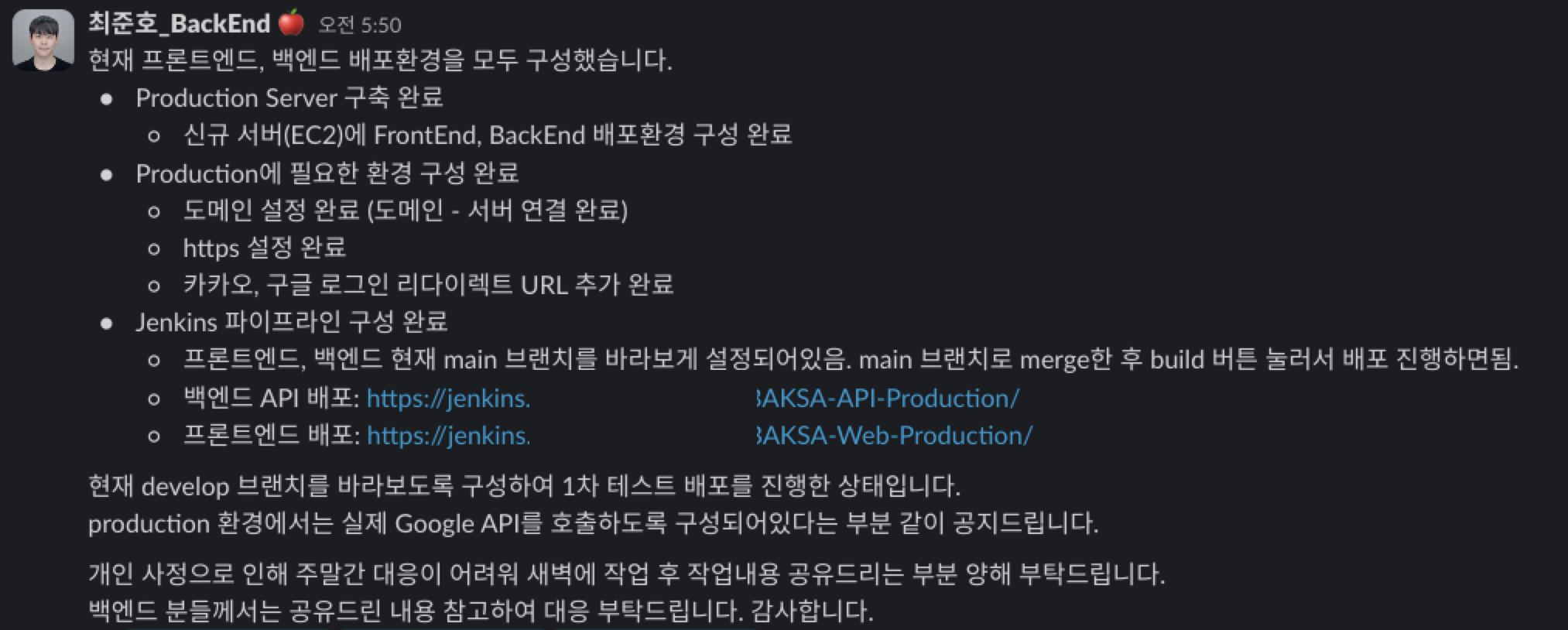 처음보는 낯선 코드들 사이에서 백엔드/프론트엔드 프로덕션 배포환경 구성, jenkins CD 파이프라인 구성, nginx 설정, 도메인 연결, 그 사이에 일어난 트러블 슈팅 등등 6시간만에 정말 많은 일이 있었지만 무사히(?) 배포할 수 있었다.