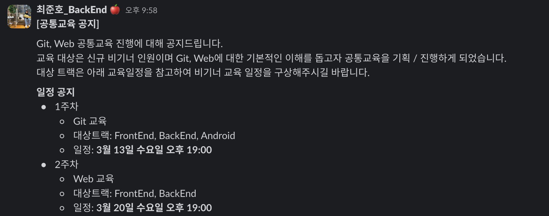각 트랙별로 본 교육이 필요한지 판단하여 각자 트랙의 교육과정에 도입할 것인지 선택하기로 했다.