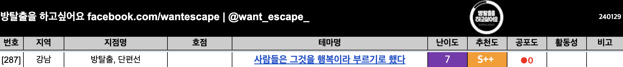 방탈출 랭킹 S++의 추천도를 자랑하는 사람들은 그것을 행복이라 부르기로 했다 정말정말 운좋게 갈 수 있는 기회가 생겼다!