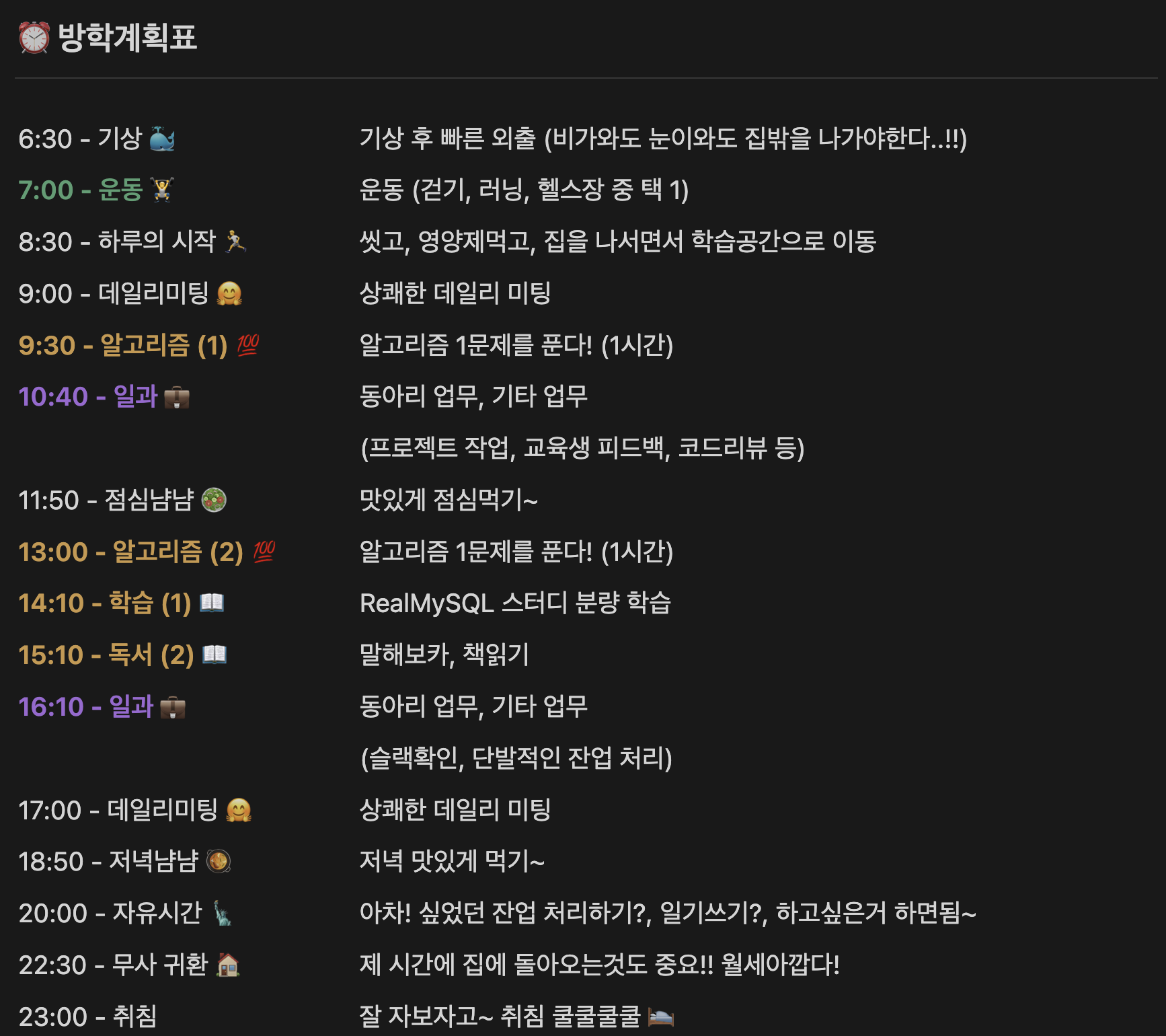 종강하자마자 작성했던 방학계획표다! 놀랍게도 방학하고 지금까지 약 80% 정도의 달성률을 보이고 있다 😊