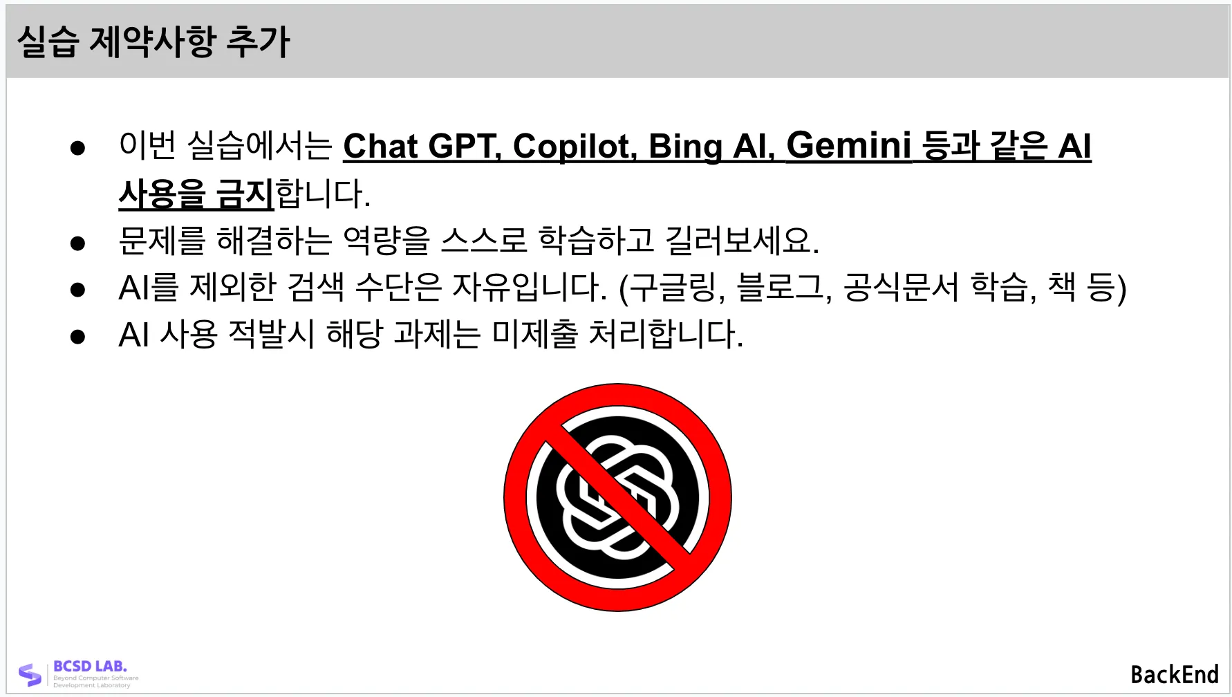 이에 조금은 강압적이지만 과제 조건에 AI 사용 금지를 추가했다.
