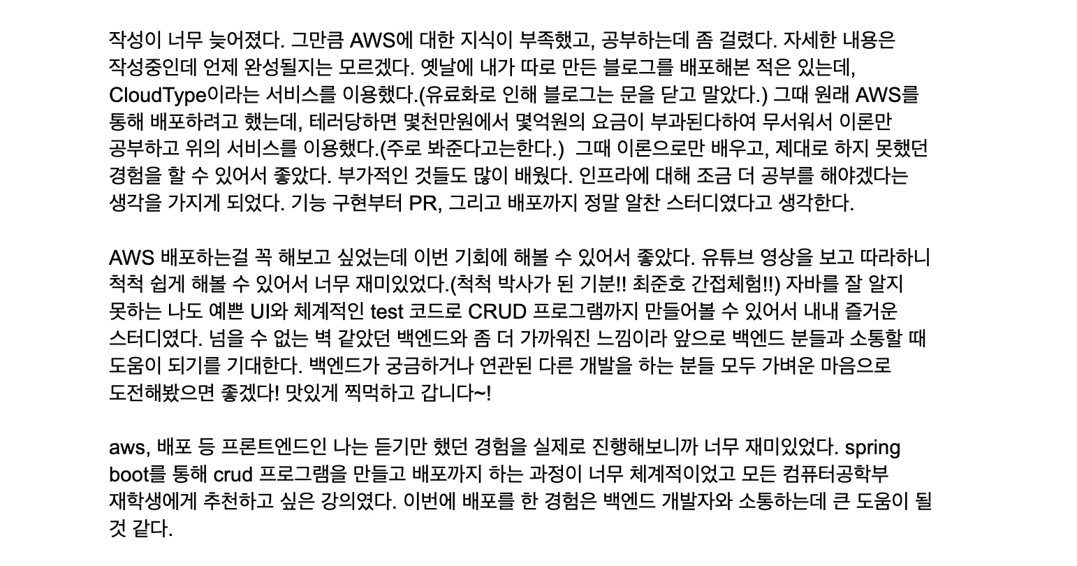 백엔드 지식이 전무한 2명과, 신규 백엔드 인원 1명 총 3명이서 잘 마무리 하는 모습을 보고 뿌듯했다. 커리큘럼에 대한 신뢰가 높아진다.