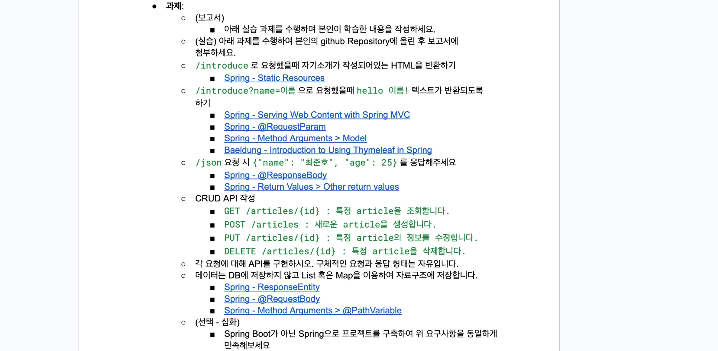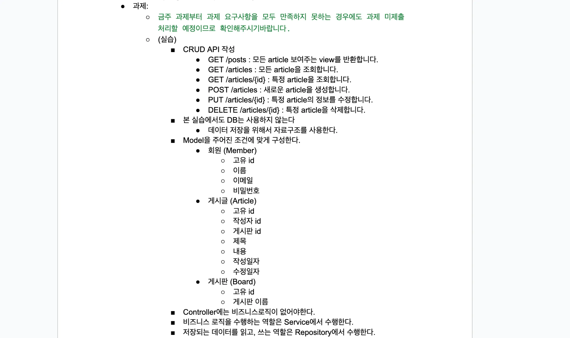 과제는 간단한 CRUD API를 작성하는 과제를 제공해줬다. 최대한 공식문서를 찾아보면서 학습하게 유도했던 초록스터디의 경험이 너무 좋았어서 이 방식을 차용해봤다.
