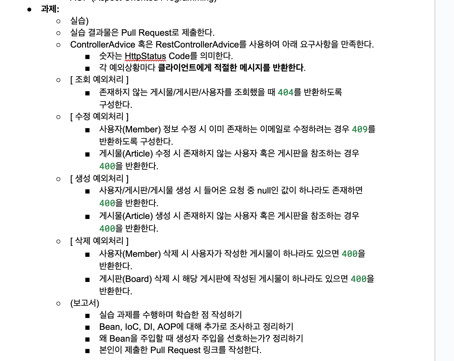 과제로는 AOP 개념을 사용하는 ControllerAdvice를 활용하여 에러 핸들링을 수행하는 과제를 제공해줬다.