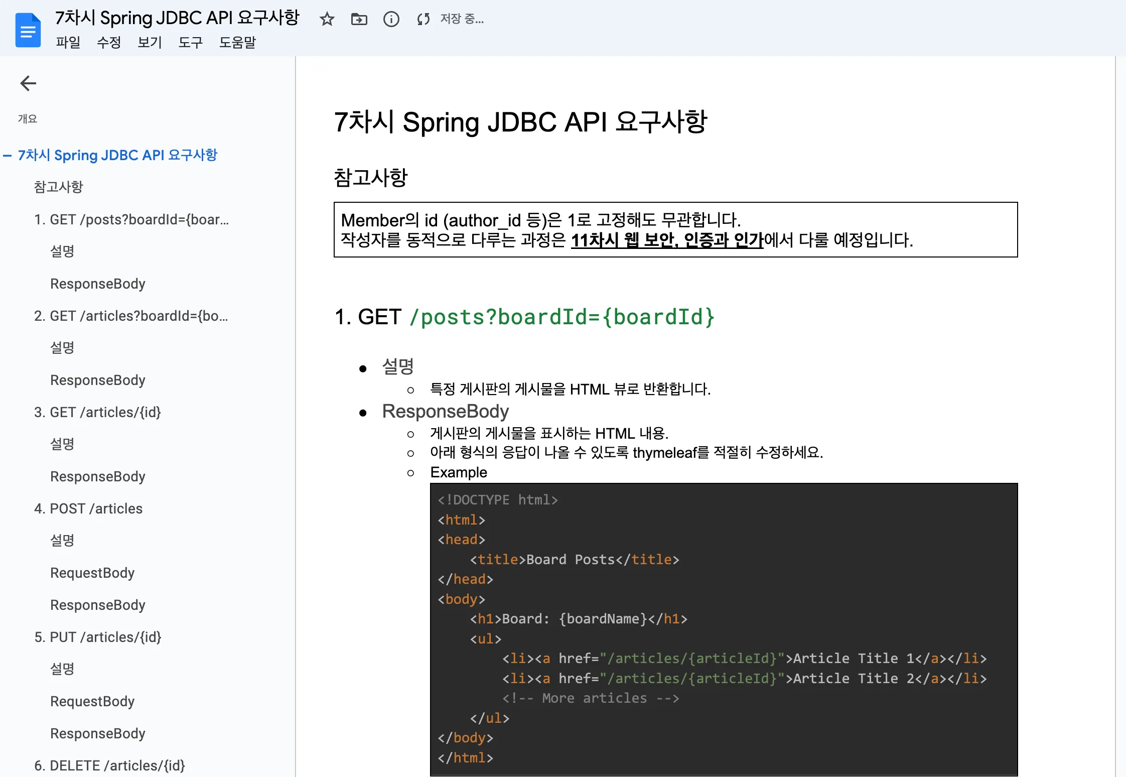 지난 주차에 요구사항을 다소 불친절하게 제공했던 것 같아 요구사항 문서를 별도로 구성해서 제공하기도 했다.
