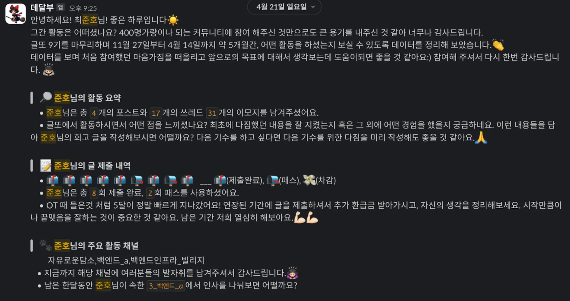 동아리내부에서 인원들이 이모지를 잘 달지 않아서 어떻게 참여도를 유발해야할까? 가 주된 고민거리였다. 이 데달부 슬랙봇이 알려주는 활동 요약은 꽤나 재미있는 데이터를 준다고 생각했다. 참여도가 높은 인원들에게 리워드를 제공할 수 있는 데이터가 될 수도 있다고 생각해 다음 스프린트 목표로 삐봇에 활동 요약 안내하기와 같은 기능을 넣어보기로 했다.