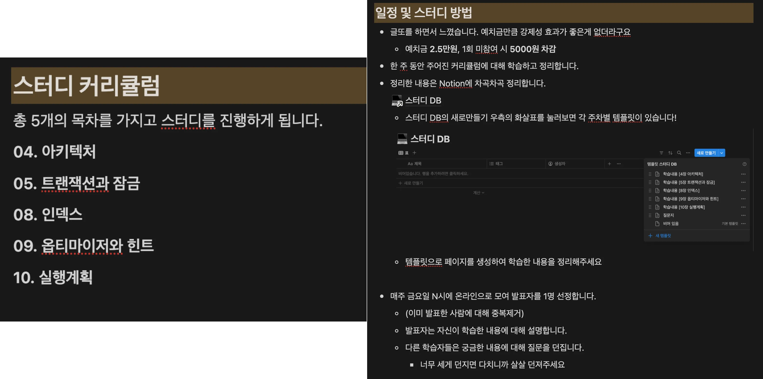 사실 커리큘럼, 스터디 방법 생각 안하고 사람부터 모으고 그 뒤에 짰는데 스터디하자! 라는 말만 듣고 같이해준 우리 스터디원들 너무 고마워… 😅