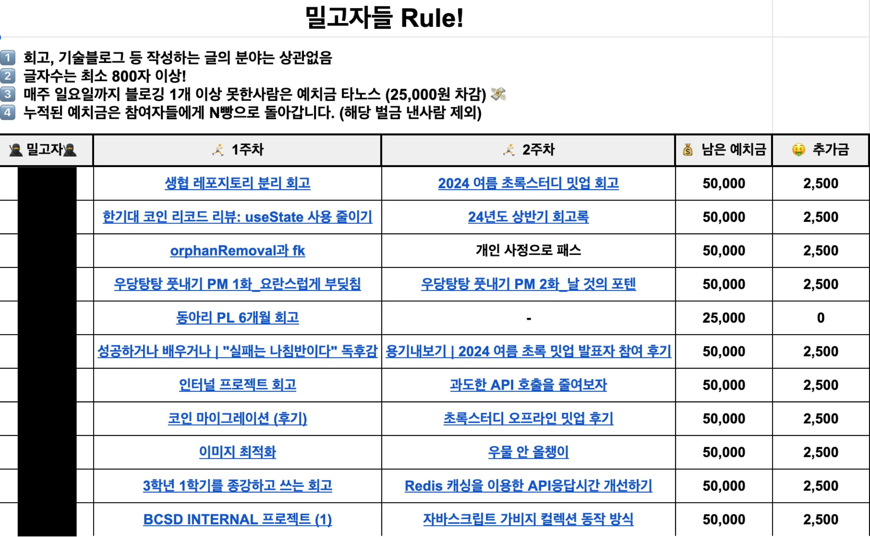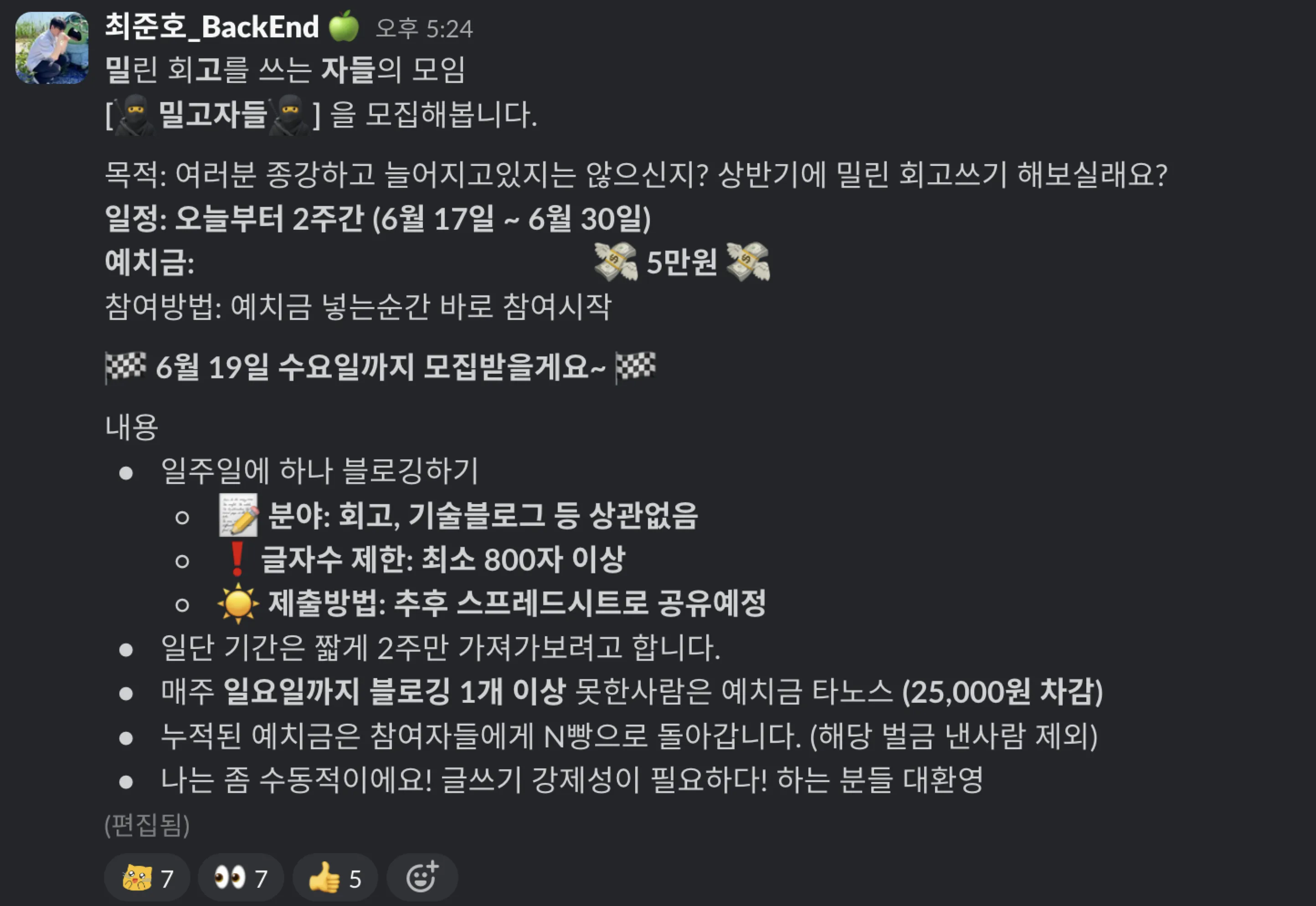 종강을 기념으로 2주간 1주일에 하나 블로그를 작성하는 스터디를 만들었다. 뭔가 블로그 쓰기 스터디 라고 하기엔 너무 딱딱하고 재미 없어보여서 이름을 재밌게 짓고자 🥷밀고자들🥷 이라는 이름을 지었다.
