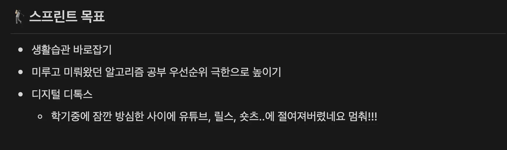 2학기의 나를 위해 3주를 투자하기로 했고 회고를 작성하고 있는 지금 어느덧 절반정도 지나갔다. 16일에 종강인데 이 시간도 금방 지나가는것 같다.