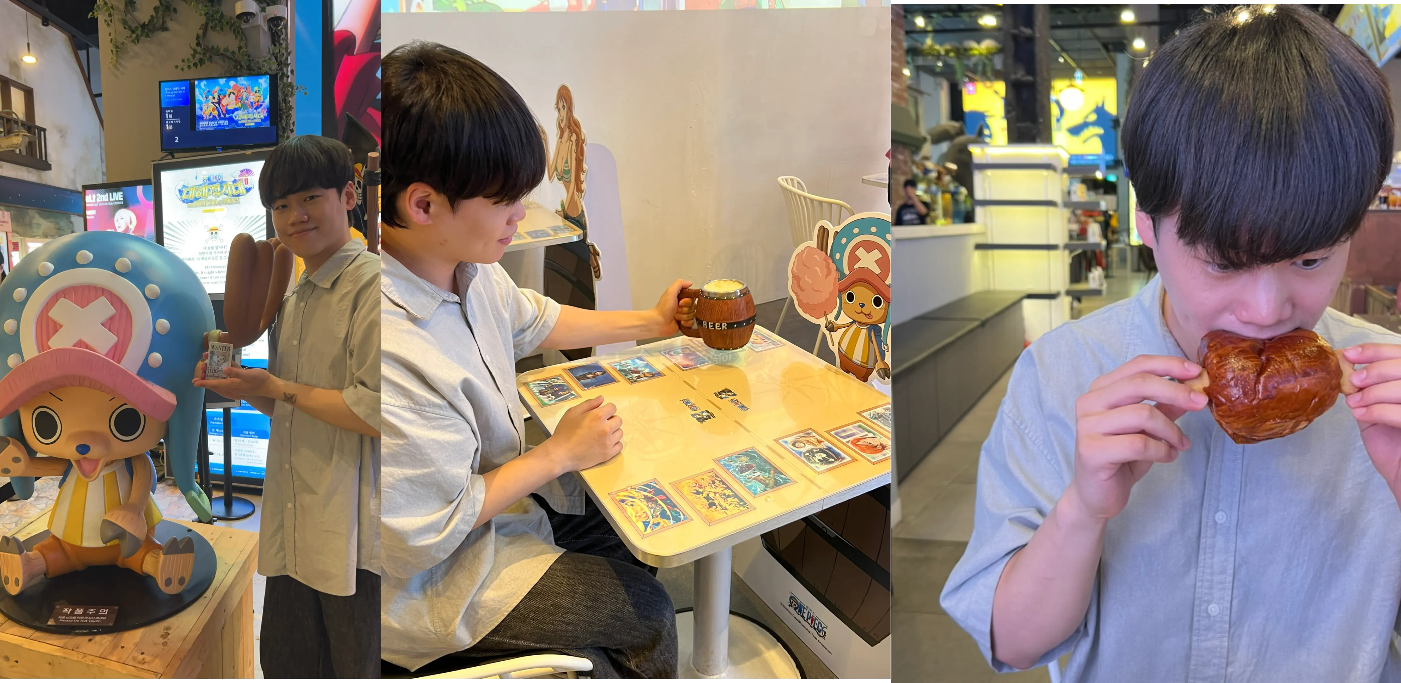 쵸파랑 사진도 찍고 한잔 했다 😅 오른쪽에 먹고있는 저 만화고기는 사실 빵이다. (고기였으면 더 좋았을텐데..ㅠㅠ)