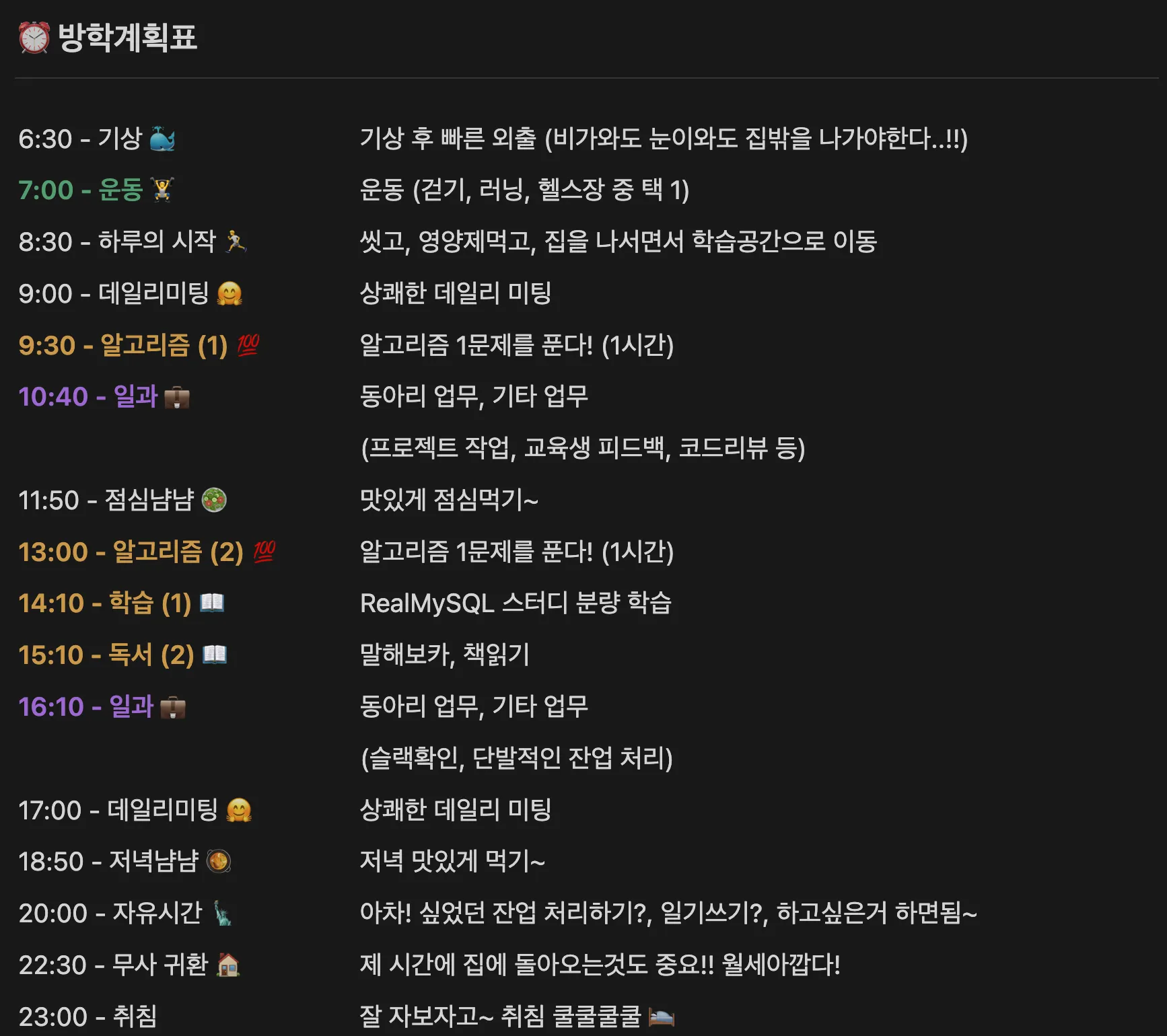 종강하자마자 작성했던 방학계획표다! 놀랍게도 방학하고 지금까지 약 80% 정도의 달성률을 보이고 있다 😊