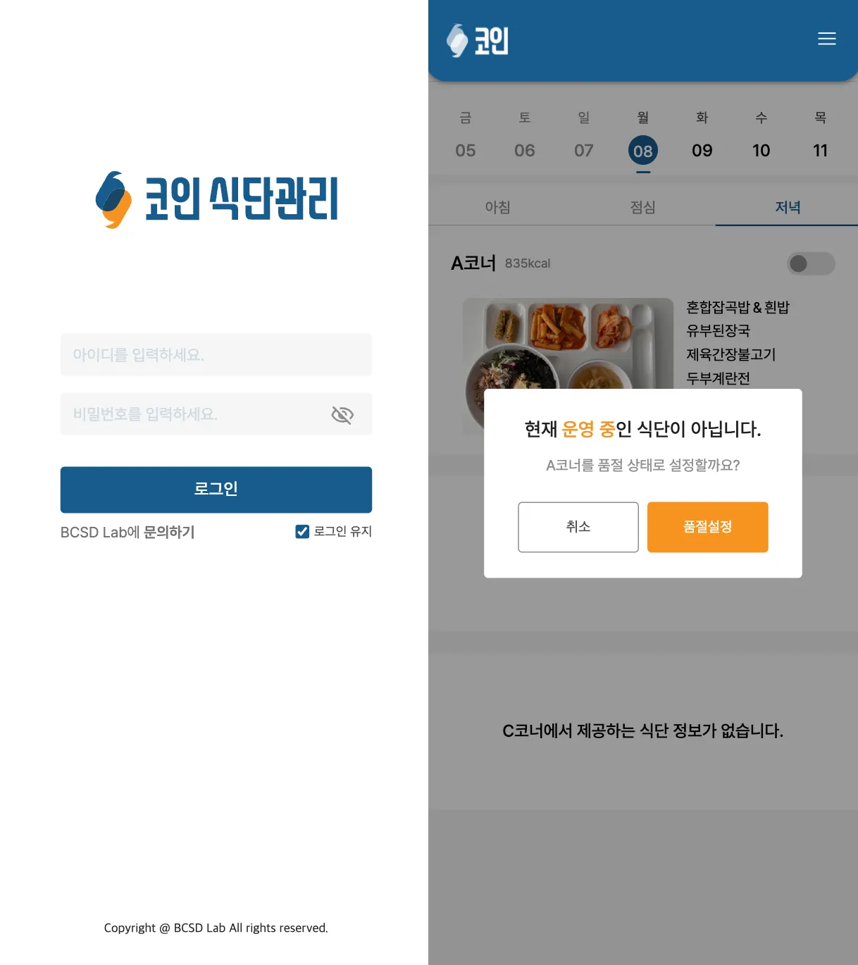 대략적인 UI는 이렇게 구성되어있다. 영양사님은 학식 사진을 촬영하여 코인 서비스를 사용중인 학생들에게 사진정보를 제공할 수 있다. 또한 품절 상황을 설정하여 앱에 푸시알림을 보낼 수도 있다.