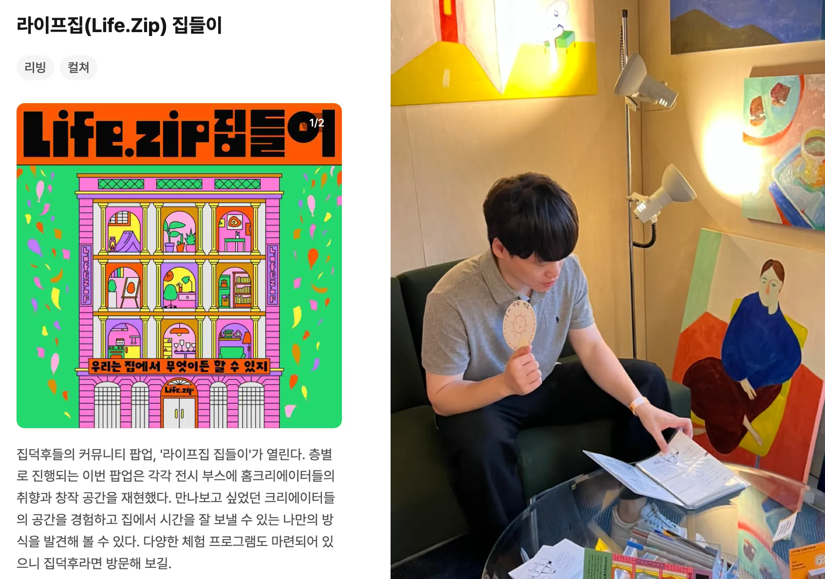 집덕후들의 커뮤니티 라이프집에서 열린 팝업스토어에 갔다왔다. 사진, 크리에이터, 식물, 커피, 요리 등등 집에서 다양한 취미로 노는 모습을 볼 수 있었다. 취미에 진심인 사람들의 모임인거같았다 ㅋㅋㅋㅋ