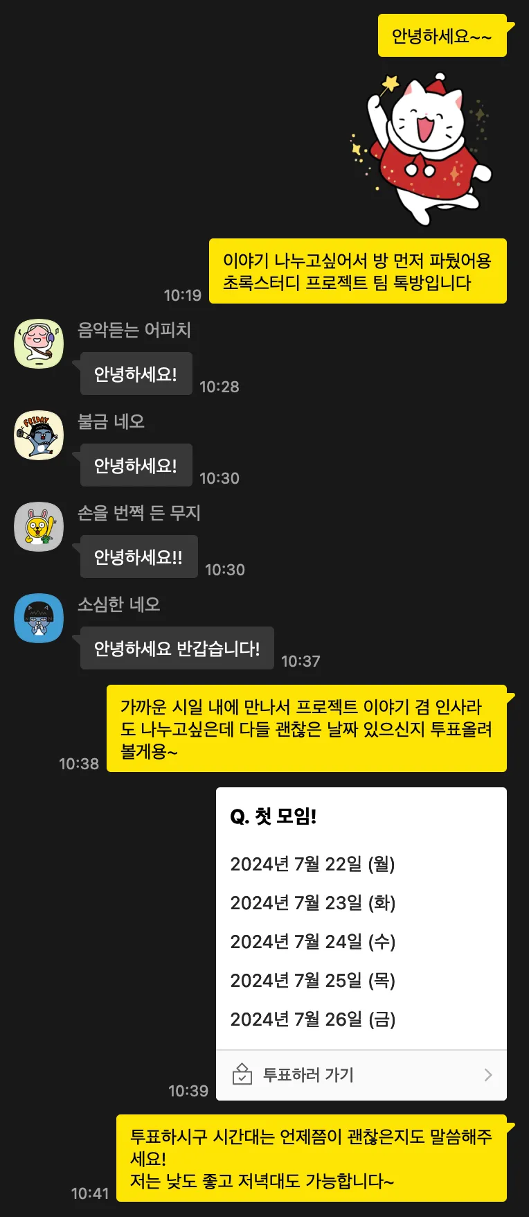 냅다 톡방에 첫 모임 날짜를 투표받고, 밥집과 스터디룸 예약을 추진했다 🤸