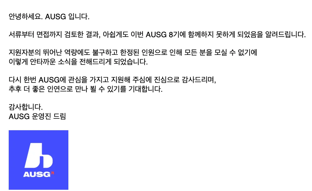 쓰다보니 피면접자의 자세라기엔 다소 거만해보이지만 뭐 어때!! AUSG이라는 좋은 조직이 있다는 것을 알게된것만으로도 성과가있었다고 생각한다 👍 AUSG 화이팅입니다~~!