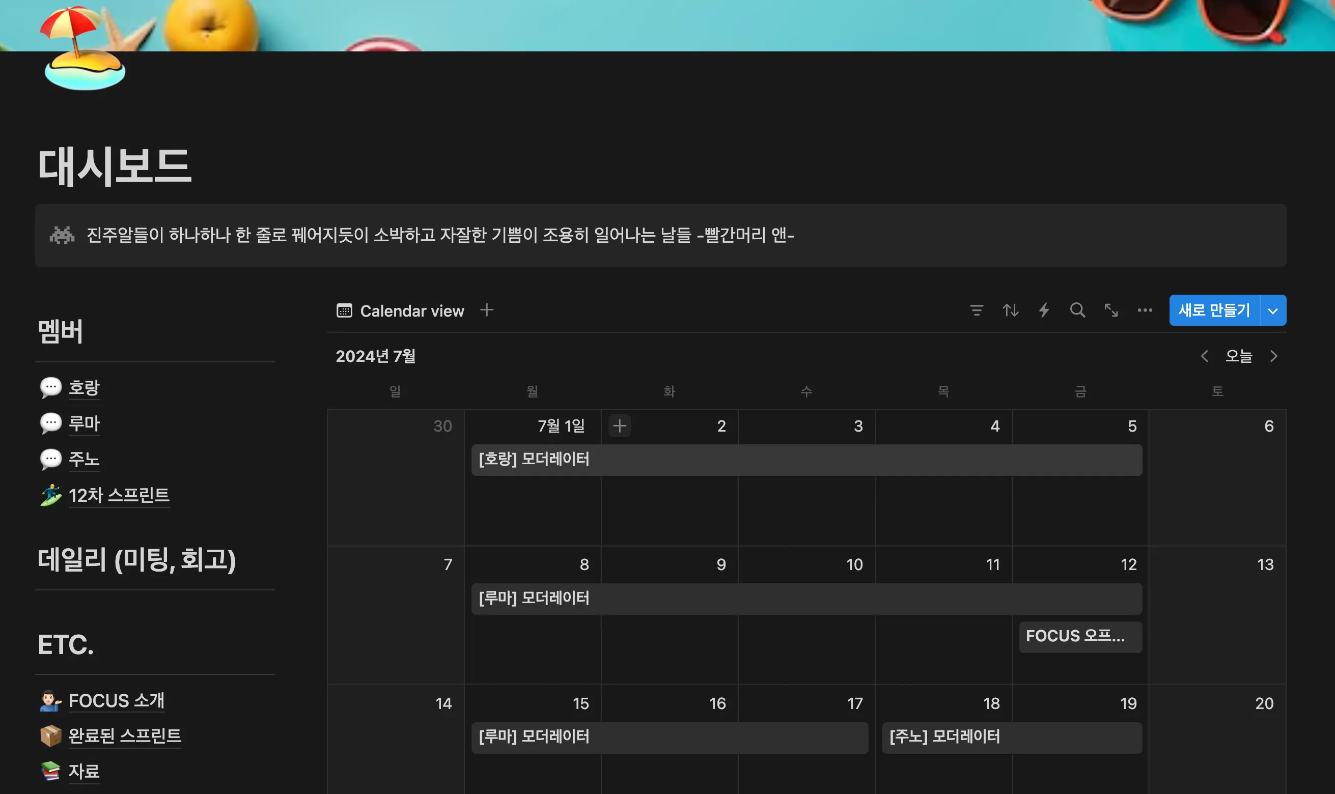 7월도 이어서 Focus를 진행했다! 9시, 17시에 데일리 미팅을 하는것이 은근히 생활패턴에 강제성을 잘 주고 있는 것 같다.