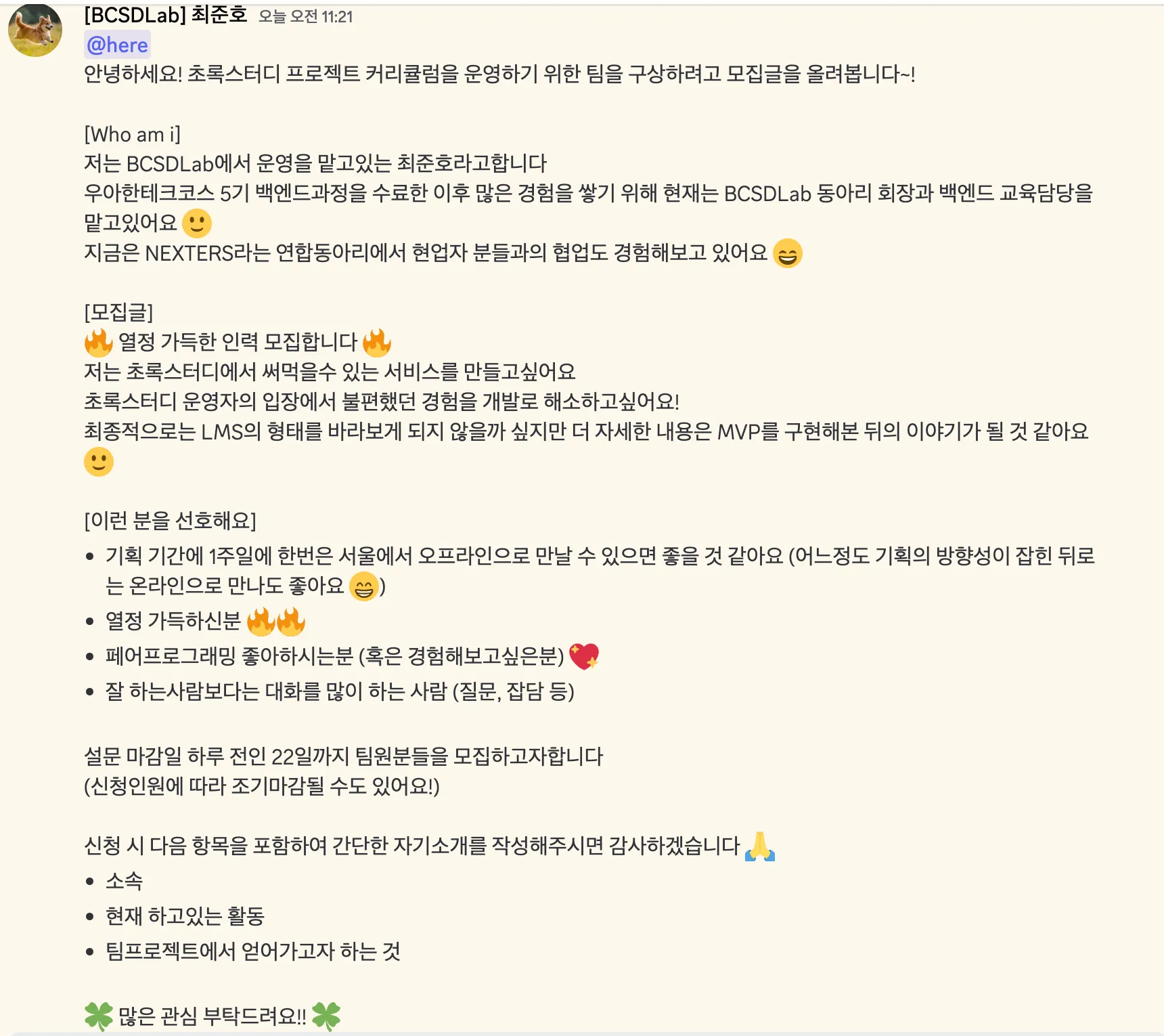 조금 고민을 해보면서 나는 이 조직에서 어떤 점이 불편한가?를 생각해봤을 때 초록스터디의 운영을 좀 더 편리하게 만들어주는 무언가가 필요하다고 느꼈고, 이에 대한 MVP를 구상하여 모집글을 작성하여 초록스터디 디스코드에 올렸다.