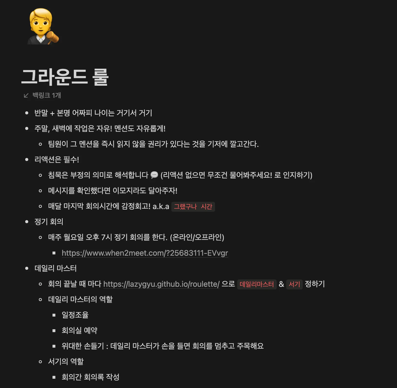 처음 만나서 정한 그라운드룰~! 이전에 우테코에서 했던 피움의 그라운드룰을 많이 참고했다 🌱