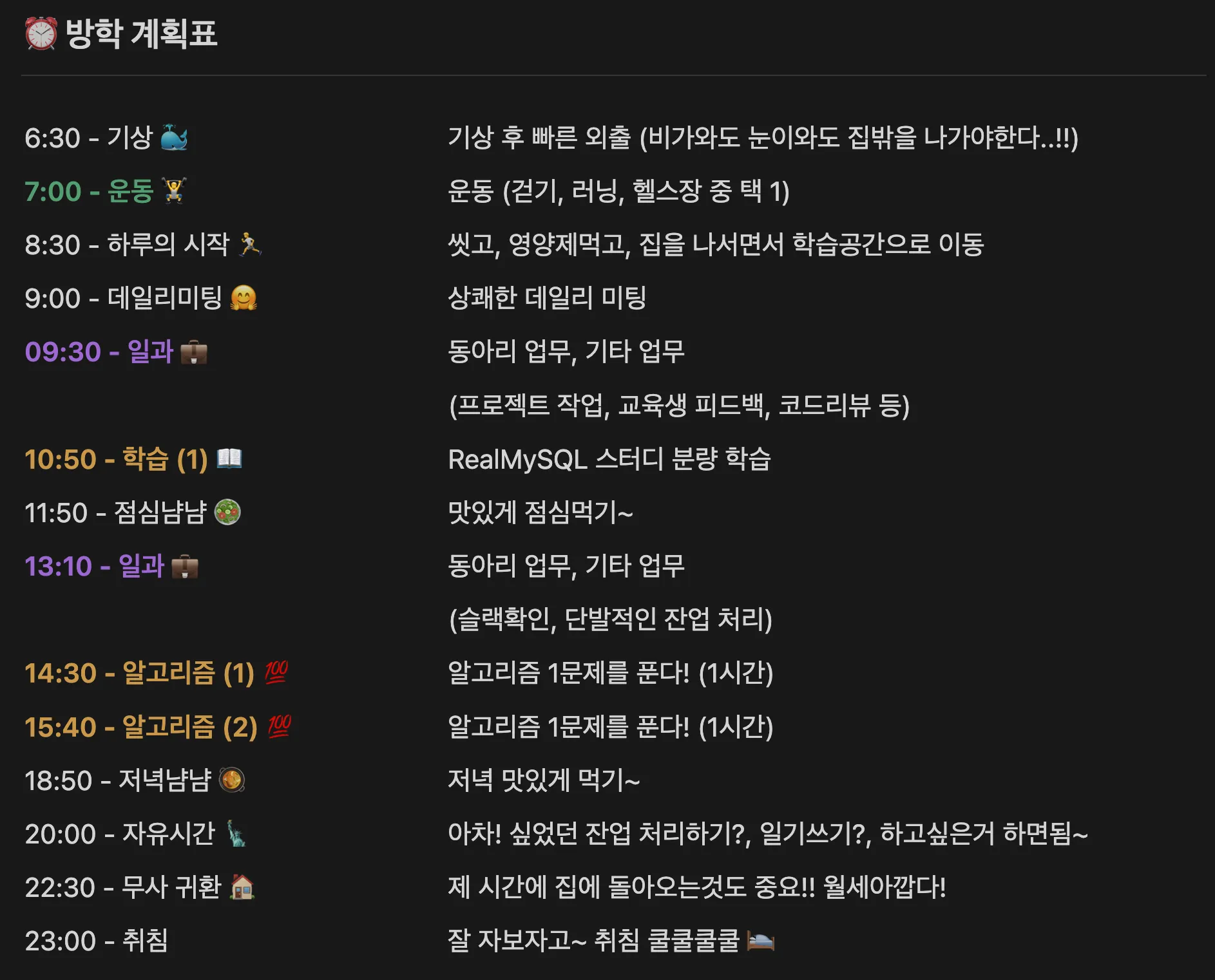 첫번째 스프린트에서는 계절학기를 수강하는 기간이라서 규칙적인 일과가 정해져있었기 때문에 방학 계획표를 작성해봤다. 스프린트 기간동안 80% 이상은 계획표대로 지키면서 살았던 것 같다.