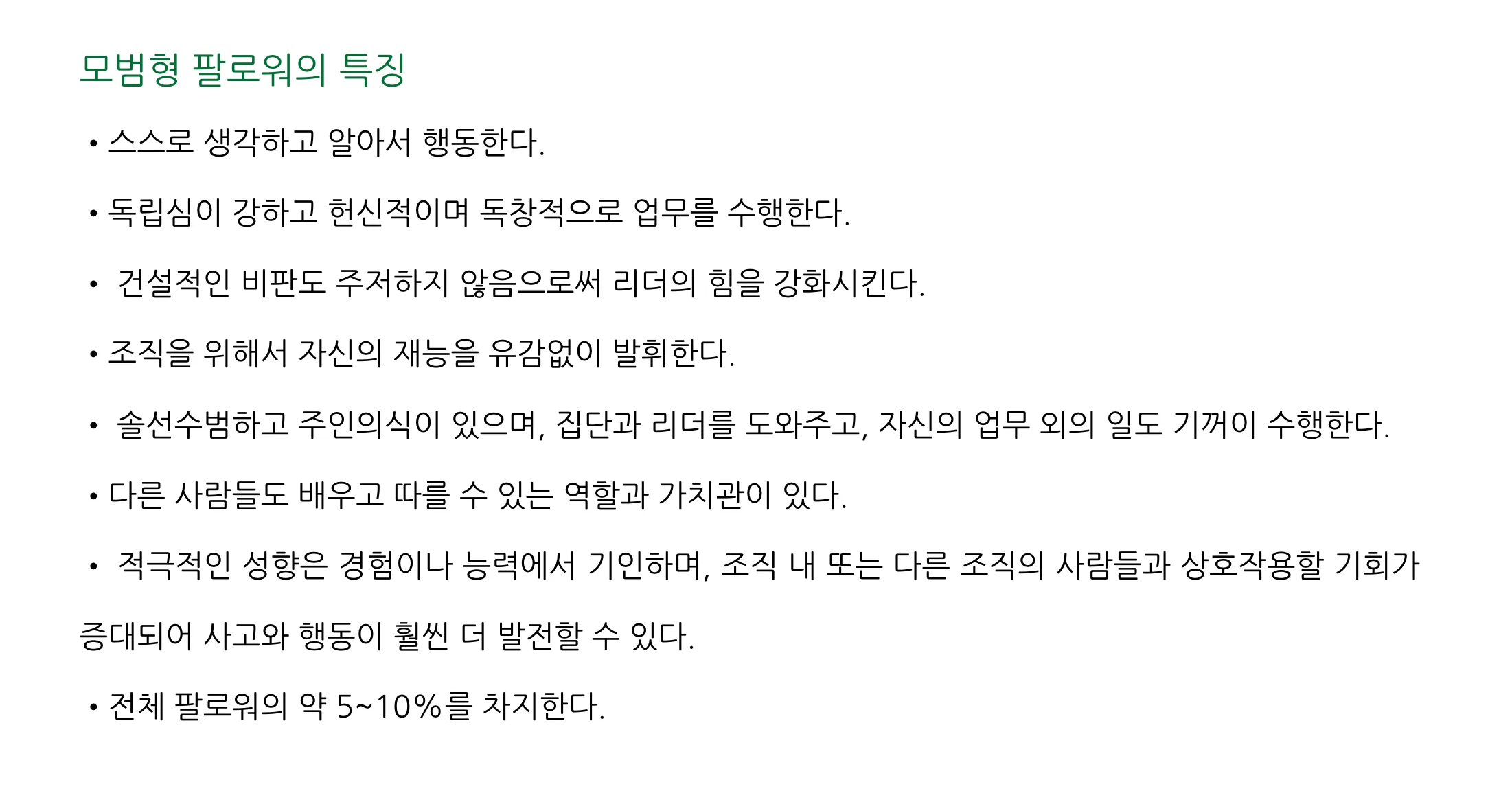 그 중 모범형 팔로워의 특징에 대한 내용을 한번 참고해봤다. 위 내용중 다른 내용들은 얼추 잘 이행하고 있다고 생각했는데 한가지 건설적인 비판을 주저하지 않는것이 나의 아쉬운점이라고 생각이 들었다.