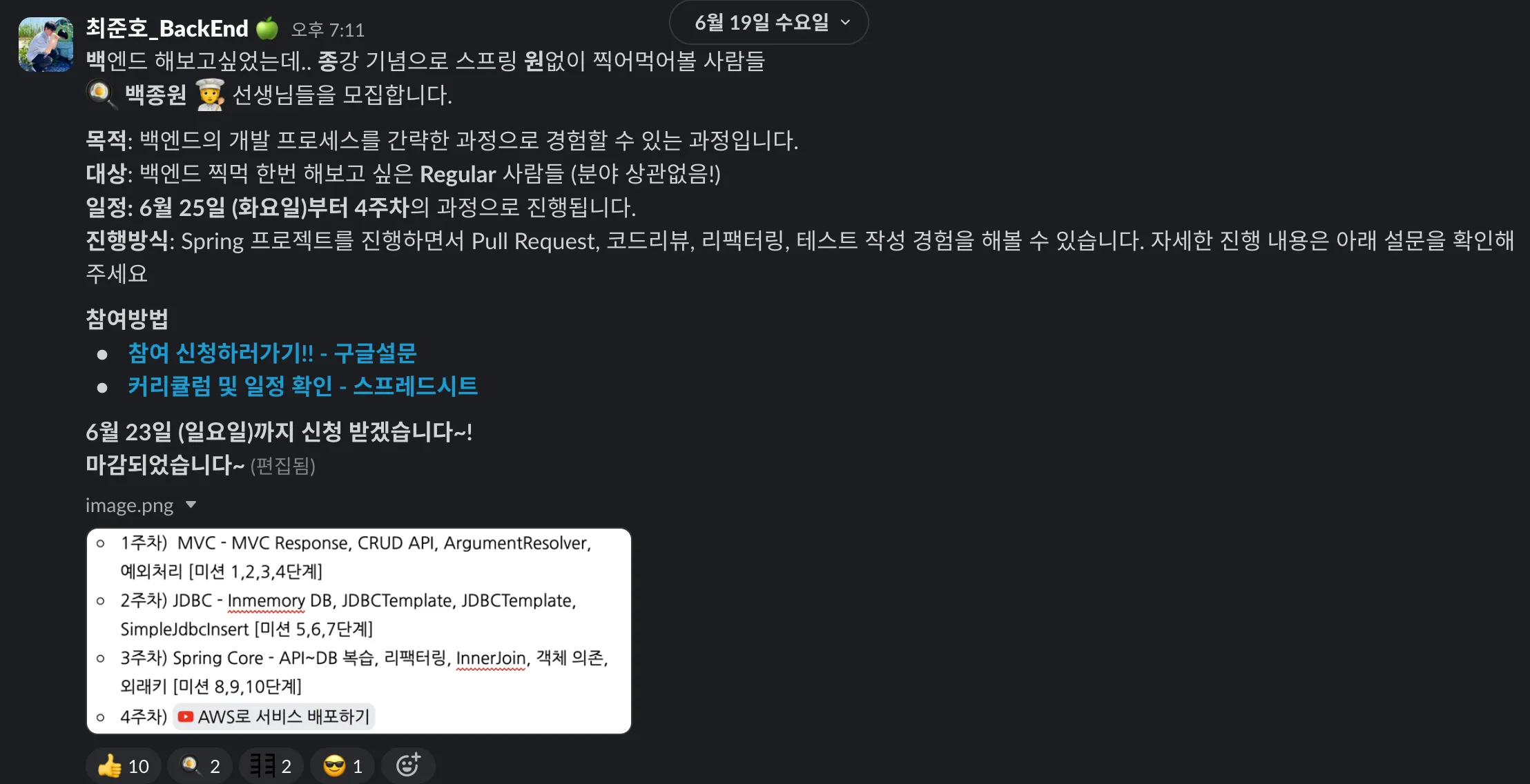 지난번에 초록스터디 과정을 무사히 수료한 소민, 승윤, 진호를 보면서 다른 트랙 사람들에게도 백엔드 찍먹 기회를 제공하려고 과정을 하나 열어봤다.