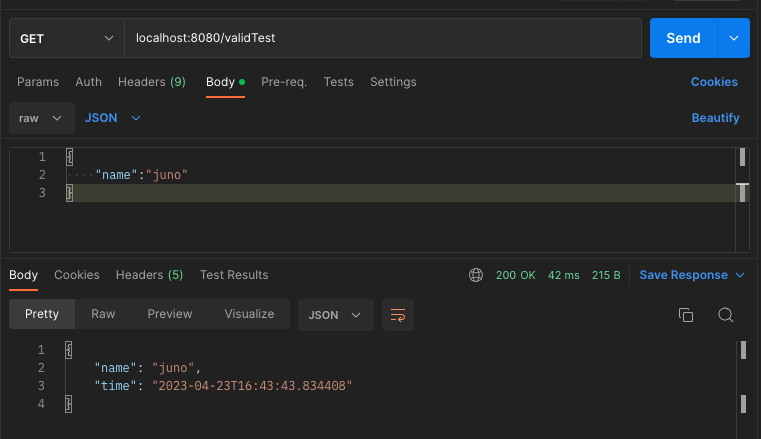 @RequsetBody를 통해 요청값이 객체로 바인딩 되었다.CustomRequestBodyAdvice를 통해@MyValid어노테이션이 붙은 객체에 대해 다음 동작을 수행한다. a. 현재 시간을 생성된 MyUser에 넣는다.- 결과적으로 파라미터값이 바인딩완료 된 순간에는 이름과 시간값이 모두 포함되어있다.