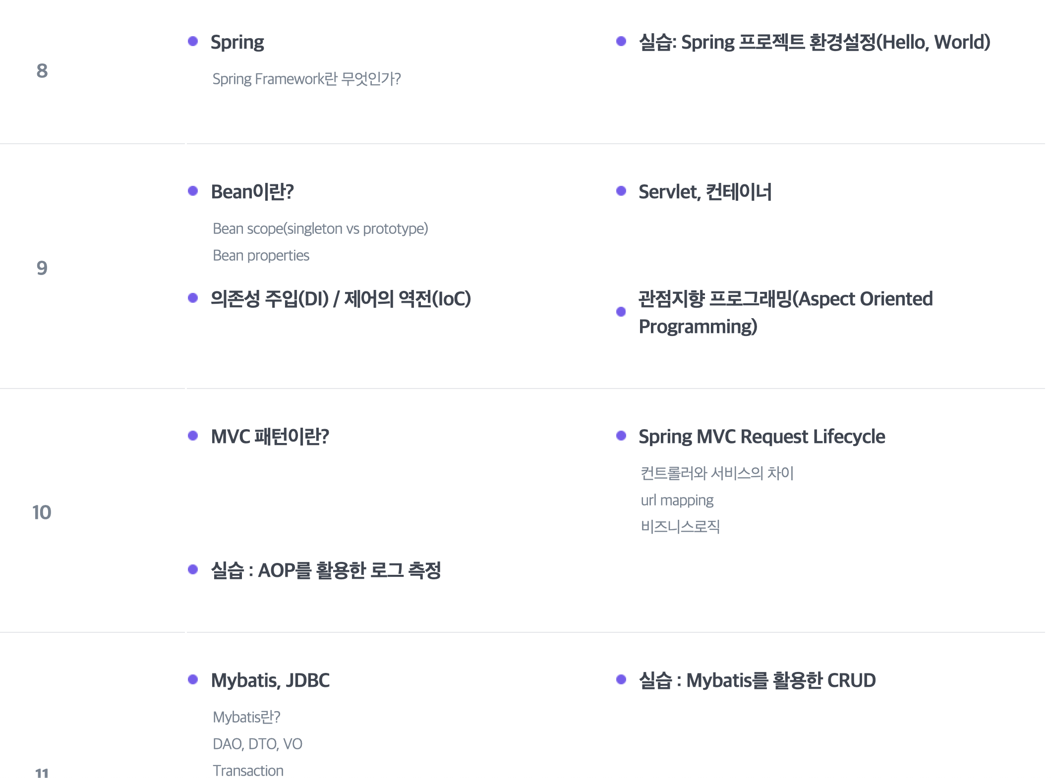 가입 조건에 군필이 있는 경우 교육생이 Java에 대한 기본적인 이해도를 갖춘 경우가 대다수였다. 때문에 커리큘럼 상에 자바 교육이 없었다.