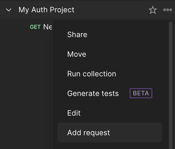 Add request를 눌러 Collection 내부에 request를 생성한다.